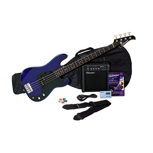 The Silvertone Bass Guitar Package is loaded with everything you need to bang out some serious bottom. Featuring the Silvertone SSLB-11 "Precision" style 4 - string bass (34" long scale, 20 fret maple neck with Rosewood fretboard, 1 split "P" style pickup, 1 volume and 1 tone control, chrome die-cast enclosed tuning machines, fully adjustable chrome bridge). The Silvertone Bass Guitar Package also includes the BA-10 bass amp (10 watts RMS, 7" bass driver, 3-band EQ, headphone jack), GT-8 tuner, gig bag, strap, cable, pickpack, and instructional DVD. Cobalt Blue